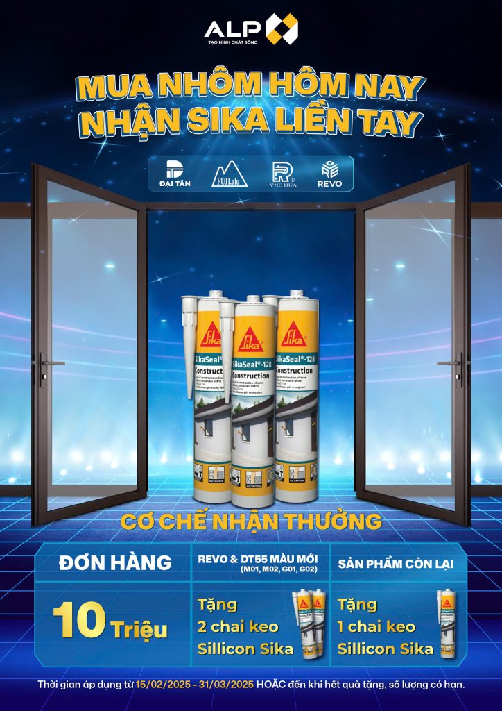 Cụ thể, chương trình ưu đãi mua hàng tặng keo Sika sẽ áp dụng cho tất cả các Quý Cơ sở sản xuất khi mua sản phẩm nhôm của các thương hiệu Đại Tân, REVO, FUJI-T và YNGHUA tại hệ thống Đại lý phân phối của ALP trên địa bàn toàn quốc.